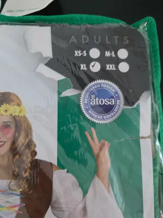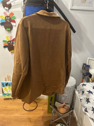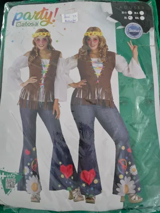 Disfraz de estilo hippie para adulto. SOLO PUESTO UNA VEZ - Chaleco marrón con cordones de colores. - Pantalones acampanados con estampados. - Diadema de flores. - Gafas rosas. - Camisa blanca con mangas acampanadas.