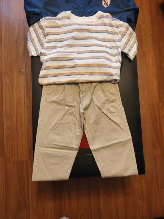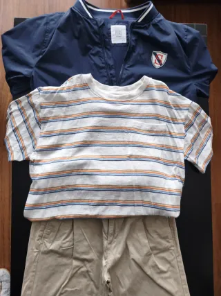 Conjunto de ropa para niño. - Chaqueta azul con detalles blancos y escudo. - Camiseta de manga corta a rayas blancas, naranjas y azules. - Pantalón beige. Todo talla niño 13-14 años. Adquirido en el corte inglés. Solamente un uso en un evento familiar. Todo el conjunto por 20€