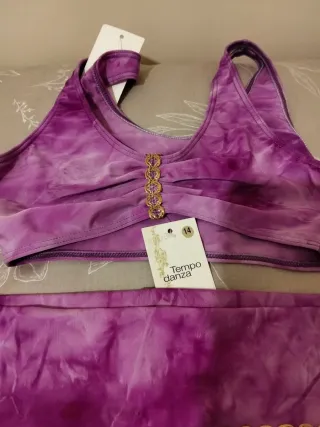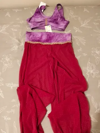 Conjunto de dos piezas para danza del vientre. - Top con diseño tie-dye morado. - Pantalón holgado en color fucsia con detalles brillantes. - Cintura elástica con adorno dorado. talla 14