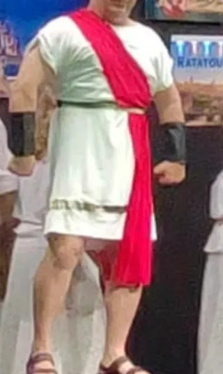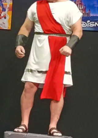 Disfraz de Hércules para hombre, ideal para fiestas temáticas o eventos. - Túnica blanca con detalles dorados. - Toga roja. - Brazaletes negros. Corona metálica de laurel