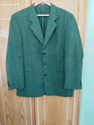 Americana de hombre en color verde oliva. Presenta un diseño moderno y elegante. Le faltan los botones delanteros y en los puños - Pura lana virgen. - Cuello mao. - Cierre de dos botones. - Bolsillos frontales con solapa. - Forro interior acolchado. Chaqueta, americana, fiesta, hombre, ropa, blazer