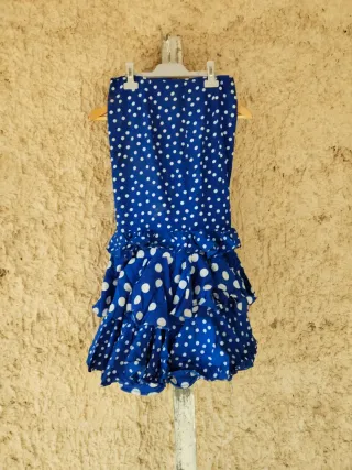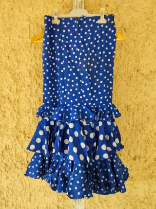 Falda flamenca con un diseño de lunares blancos sobre fondo azul. Presenta volantes en cascada que le dan mucho movimiento. - Diseño de lunares. - Volantes en cascada. Traje de flamenca, traje de sevillana, fiesta, moda, aire libre