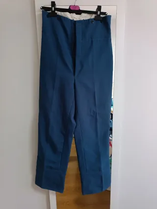 Traje de corto de mujer de color azul. Consta de 3 piezas: 1. Pantalón de talle alto, talla 44. 2. Chalequillo con botones y pequeños bolsillos, se ajusta atrás, talla 48. 3. Chaqueta con raya diplomática, talla 46. Usado en una romería. Comprado en tienda "El tamboril", marca HP. ** Regalo la funda del traje, 2 camisas y 8 caireles con detalle de herraduras.
