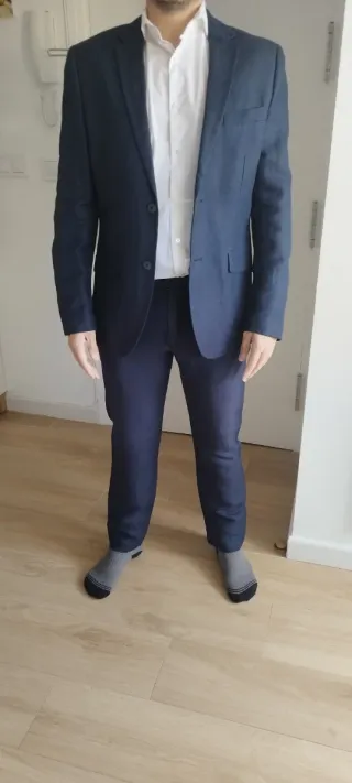 Chaqueta Zara negra talla S = 25€. Traje Easy Wear azul marino chaqueta talla 44, pantalones talla 36 Slim Fit = 60€. Traje Mango Azul claro talla 36 y 38 el pantalón = 70€. Todo con 1 solo uso.