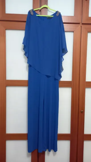 Elegante traje de ceremonia en un vibrante color azul pavo real. Perfecto para eventos especiales. - Diseño con capa superpuesta. - Adornos de pedrería en los hombros. - Pantalón palazzo.