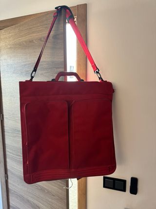 Funda para transportar trajes o vestidos de forma segura y organizada. Cuenta con asas y correa para colgar. - Dos bolsillos frontales con cremallera. - Asa de mano reforzada. - Correa ajustable para colgar. - Cierre superior con cremallera.