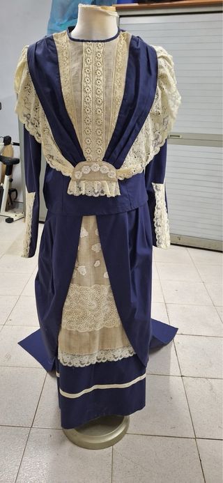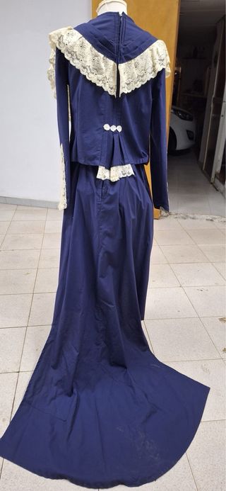 Este disfraz confeccionado por una modista evoca la elegancia de épocas pasadas con sus detalles intrincados. - Diseño de dos piezas con falda larga. - Cuerpo superior con encaje y detalles de volantes. - Mangas largas con puños de encaje. - Adorno de encaje en el escote y la cintura.
