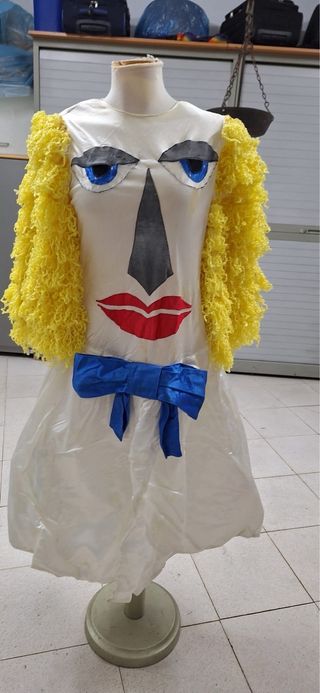 Disfraz divertido con diseño de cara, ideal para fiestas o eventos. - Mangas con textura amarilla. - Detalle de lazo azul en la cintura. - Falda blanca con acabado abullonado.