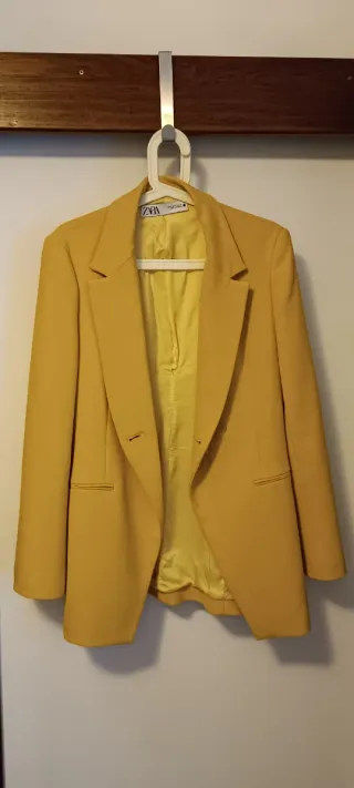 Blazer y pantalón elegante de Zara en color amarillo. La tela tiene peso y caída y se aprecia de calidad. Puesto una sola vez - Diseño clásico. - Cierre de un botón. - Bolsillos frontales con pespuntes. Envíos por Correos sólo a Canarias. Venta sólo a través de Wallapop