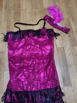 Conjunto de disfraz estilo Charleston con detalles brillantes y flecos. - Diseño con lentejuelas rosas. - Flecos negros en el bajo. - Incluye diadema a juego con pluma. - Talla única.