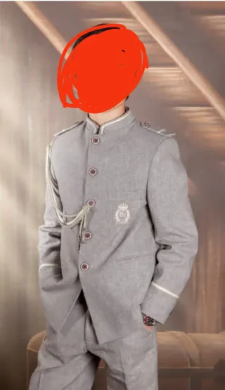Traje de comunión de estilo militar. - Chaqueta con cuello mao y detalles en los hombros. - Cierre de botones. - Escudo bordado en el pecho. - Pantalón a juego.
