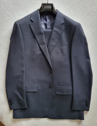 Traje actual de lana color azul oscuro. Como nuevo. No más de 3 o 4 usos. Limpieza en tinte después de la última puesta. Corte clásico. Chaqueta talla 52. Pantalón talla 46. Envío rápido perfectamente embalado.