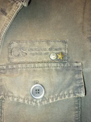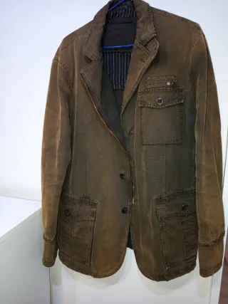 Chaqueta de estilo militar en tono marrón verdoso, con un diseño envejecido. Marca la talla 54 correspondiente a una talla L. - Cierre de cremallera y botones. - Bolsillos frontales con solapa. - Cuello camisero. - Puños con detalle desgastado.