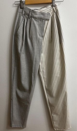 Pantalón de traje con un diseño único de dos estampados. - Diseño asimétrico con cuadros y rayas. - Cintura con trabillas. - Bolsillos laterales.
