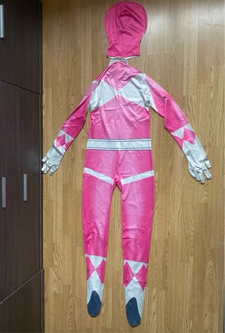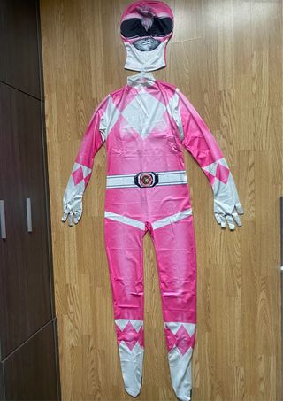 Disfraz completo de Power Ranger rosa, ideal para fiestas temáticas o eventos. - Incluye mono y máscara. - Medida de 170 cm - Sin estrenar - Precio negociable y oferta si se compran los 3 juntos (rosa, amarillo y rojo)