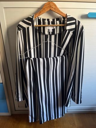Vendo un montón de cosas porque me voy a mudar y necesito deshacerme de todo lo posible. Hago rebaja si te llevas varias cosas de mi perfil y escucho ofertas. Puedes venir a ver y probar sin compromiso. Conjunto de blazer y falda en tonos negros y grises. La chaqueta es de corte clásico con botones. - Chaqueta con doble abotonadura. - Falda larga con abertura. - Tejido con textura sutil.