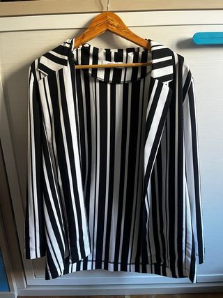 Conjunto chaqueta pantalón a rayas blancas y negras de tejido fijo 100% poliester. Chaqueta talla 42 (pero tómalo como 40): Hombros: 50cm Largo mangas: 63fm Largo chaqueta: 77cm Pantalón talla 42 (pero tómalo como 40): Cintura: 41cm Cadera: 51cm Largo: 110cm