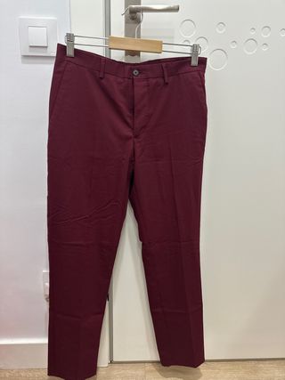 Pantalones de vestir de corte clásico y americana en color granate oscuro del zara. - Diseño liso. - Cintura con trabillas. - Cierre de botón y cremallera. - Ideal para bodas, comuniones o eventos importantes y elegantes. (Perdon por las fotos mal echas, lo entregaria planchado.)