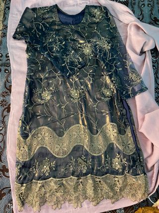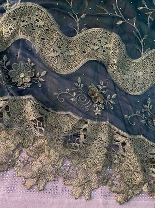 Elegante traje indio de dos piezas con un diseño sofisticado. - Tejido con detalles florales dorados. - Adornos de encaje en el bajo y las mangas. - Acabado brillante.