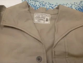 Uniforme M67 del Ejercito Español, perteneciente al Ejercito de Tierra, utilizado en los años 60 y 70 hasta la introducción de los nuevos modelos. Uniforme compuesto por camisola y pantalón. Camisola y pantalón - Chaqueta con cuello camisero y cierres de botón. - Dos bolsillos en el pecho de la chaqueta. - Parches reforzados en los codos. - Pantalón con múltiples bolsillos cargo. - Puños y tobillos elásticos.