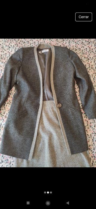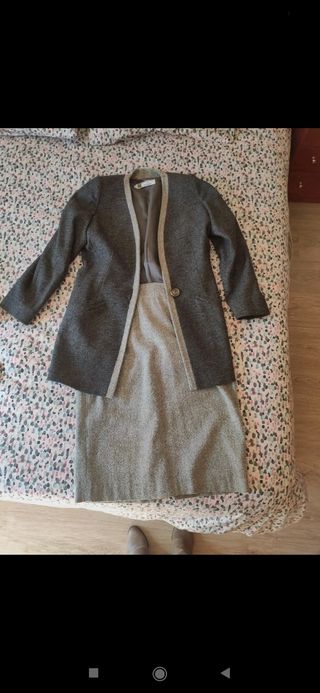 Conjunto de chaqueta y falda en tono gris. La chaqueta tiene un diseño abierto con un botón. Tejido grueso, como de lana. - Chaqueta con forro interior talla 38, M. - Falda de corte recto talla 40, L.