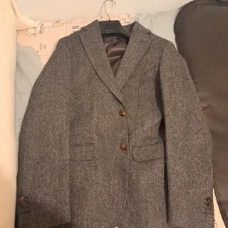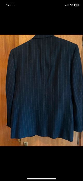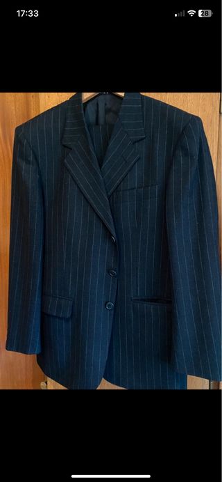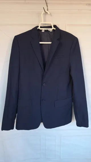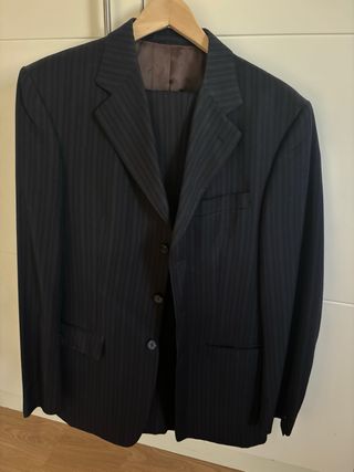 Traje de dos piezas de corte clásico. - Chaqueta con dos botones talla 46 - Bolsillos frontales con solapa. - Puños con botones. - Pantalon a juego talla 38. - Bajo sin coger para que no tenga marcas. - Un solo uso y llevado a la tintorería. - Incluye funda original. - Lo vendo porque ya no le sirve.
