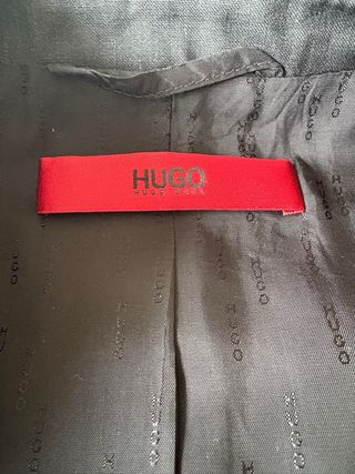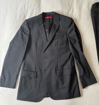 Elegante traje de Hugo Boss en color negro. Ideal para eventos formales. Utilizado solo 1 dia - Chaqueta con solapa de muesca. - Cierre de dos botones. - Bolsillos frontales con solapa. - Puños con botones. - Forro interior satinado con etiqueta roja de la marca.