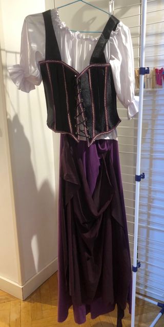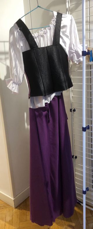 Conjunto de disfraz de inspiración medieval. - Blusa blanca con mangas abullonadas y cuello fruncido. - Corsé negro con detalles en hilo brillante y lazada frontal. - Falda larga de corte asimétrico en tono morado. - Lo use como traje de Dulcinea