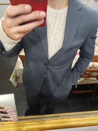 Traje de vestir en color gris marengo. Un conjunto elegante y moderno. Ojo la talla en etiqueta 48 pero yo mido 1,75 y me queda bien. Recomendado para personas como yo y un pelín más gorditas ya que yo estoy flaco. - Chaqueta de corte clásico. - Pantalón a juego.