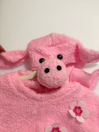 Disfraz de cerdita muy suave y cómodo. - Diseño de cuerpo entero con capucha. - Detalles de flores aplicadas en el pecho. - Puños y tobillos con elástico. - Orejas y hocico de cerdito en la capucha.