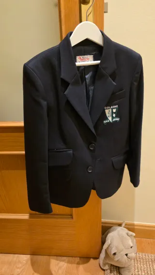 Chaqueta americana de color azul con el escudo del colegio bordado. Colegio San Jaime de la TALLA 6 - Escudo del colegio San Jaime bordado en el pecho. - Cierre de dos botones. - Dos bolsillos delanteros con solapa.