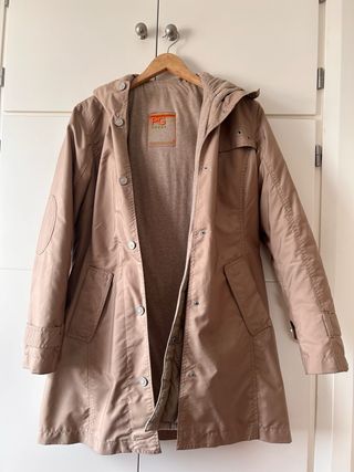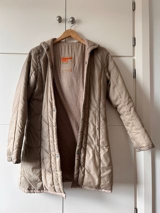 Blazer original de Purificación García en color beige/tostado. Cuenta con capucha, cierre frontal con cremallera y con botones a presión para juntar con el forro acolchado y bolsillos delanteros. En el interior lleva forro acolchado, que aporta abrigo sin resultar pesada. Corte recto y favorecedor.
