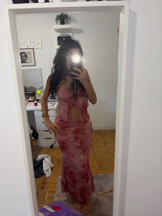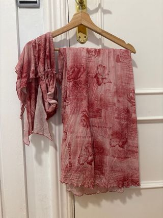 Conjunto veraniego de top y falda larga con estampado. - Diseño con tirantes y escote. - Falda con detalle de cordones laterales. - Estampado floral en tonos rojos y rosas.