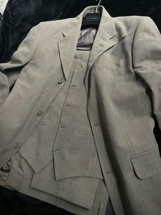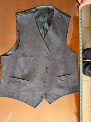 Tres piezas: pantalón de pinza, chaqueta y chaleco Talla 60. Muy bien cuidado y solo ha sido usado una vez. Envio disponible o recogida en Málaga.