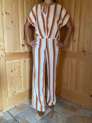 Conjunto de dos piezas con un diseño de rayas verticales. - Parte superior con escote cruzado. - Pantalón de pierna ancha. - Tejido texturizado.