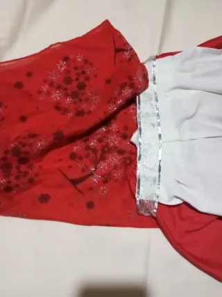 Conjunto de traje de pastora con varios complementos.Largo falda 48cm , largo chaleco42 cm y ancho42cm. Hecho de modista a estrenar. Talla de 7 a 9 años, según la niña se ajusta la cintura de la falda y el chaleco con cordones. - Cuerpo negro con cordones rojos. - Falda roja con delantal blanco. -Pañuelo rojo con detalles brillantes de navidad - Bolso a juego con lazo.