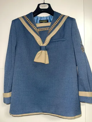 Traje de comunión de la marca Nova Drima. - Diseño de marinero en color azul. - Detalles en beige. - Talla 13. -Talla de zapatos 36.