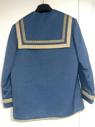 Elegante traje de chaqueta de la marca Zara. - Chaqueta de corte moderno. - Pantalón a juego. - Color azul marino. talla pantalón 38 y chaqueta 46 Un solo uso