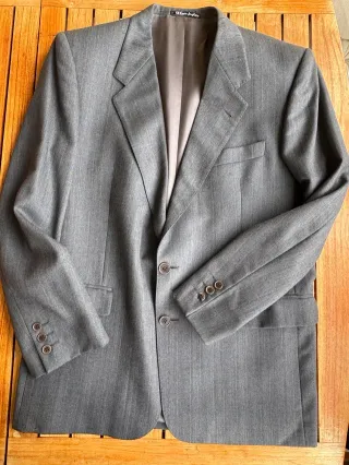 fabuloso traje de caballero Edwin Woodhose, vendido por El Corte Inglés, color gris, con mini rayitas gris claro y alguna azul, T52, aproximadamente M/L, verifica las medidas en las fotos, , Pura lana virgen, marca El Corte Inglés, super calidad. pantalones largo 104cm aproximadamente, alargable otros 5 o 6. Corte regular clásico, no entallado. puesto sólo una vez para una boda,enviado limpieza de tintorería para su venta, pero por haber estado guardado mucho tiempo los bolsillos interiores del pantalón presentan tono amarillento (no sucio), se muestra en las fotos, no afecta a su estado