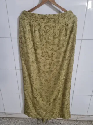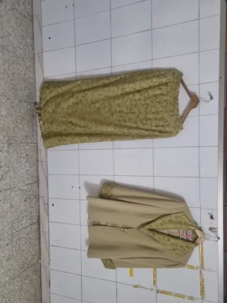 Elegante traje de fiesta de la marca Los Montesco. Ideal para ocasiones especiales. - Diseño con detalles bordados. - Combinación de colores beige y verde oliva.