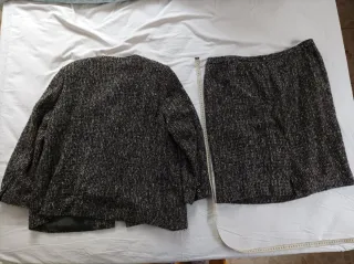 Conjunto de chaqueta y falda de tweed con 38% lana. Forro viscosa. Chaqueta con cuello redondo y cierre de botones. Falda con botón y cremallera. Tejido con bolitas, forro de la falda roto. Ver fotos Preguntar por descuentos por lotes