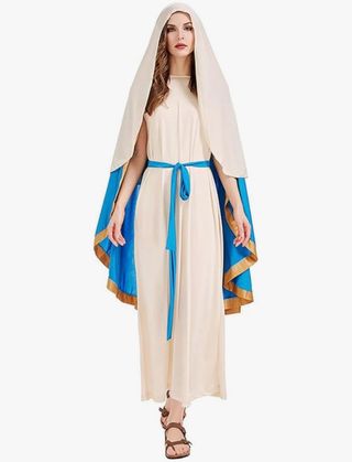 Este traje representa a la Virgen María, ideal para representaciones o disfraces. - Vestido largo de color beige. - Capa azul con detalles dorados. - Cinturón azul a juego. Nuevo sin estrenar, me equivoque al comprarlo y por eso lo vendo. Me costo 30€ y lo vendo por 20€.