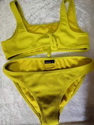 Conjunto de bikini de dos piezas con un diseño moderno y textura. - Parte superior con nudo frontal. - Braguita de corte clásico. - Tejido con relieve. Regalo un top de colores floral. Envío o recogida en Málaga Centro, calle Trinidad Grund.