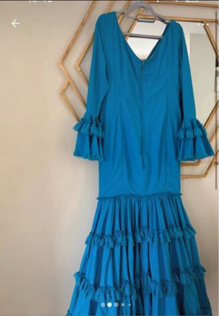 Traje de flamenca azul, usado una sola vez. Diseñado a medida para un ajuste perfecto. - Mangas largas con volantes y encaje. - Falda larga con múltiples volantes y detalles de encaje. - Cierre trasero con cremallera.
