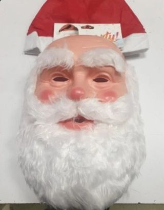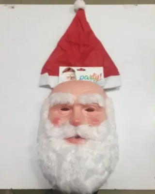 Máscara de Papa Noel para fiestas o disfraces. - Diseño clásico de Papa Noel. - Barba y cejas blancas. - Nariz y mejillas rojas.