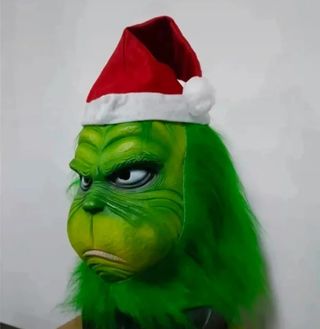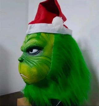 Máscara del Grinch con gorro de Papá Noel, perfecta para fiestas o disfraces. - Diseño inspirado en el personaje. - Gorro de Navidad rojo incluido.