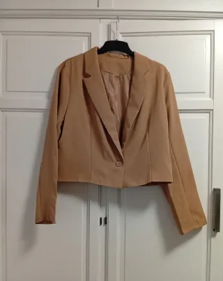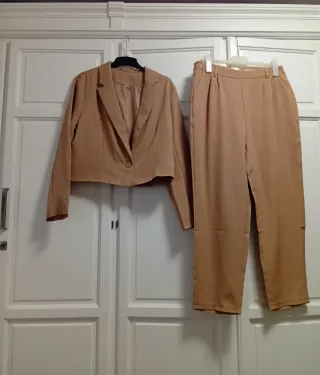 Conjunto de traje de chaqueta y pantalón camel de Shein. (Talla XL). - Chaqueta corta con un botón. Va forrada por dentro. - Pantalón de corte recto. Se abrocha mediante cremallera lateral. Nuevos. A estrenar. Medidas chaqueta: Axila 56 cm (por delante). Cadera 50 cm (por delante). Largo 53 cm. Medidas pantalón: Cintura 42 cm (por delante). Cadera 56 cm (por delante). Largo 99 cm.