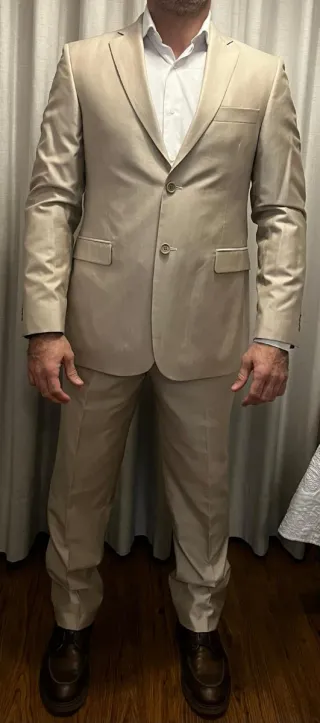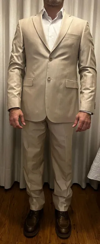 Traje de hombre sin estrenar, con etiqueta. - Color beige. - Talla M (equivalente a 38-40 / 48-56). - Diseño clásico y elegante.