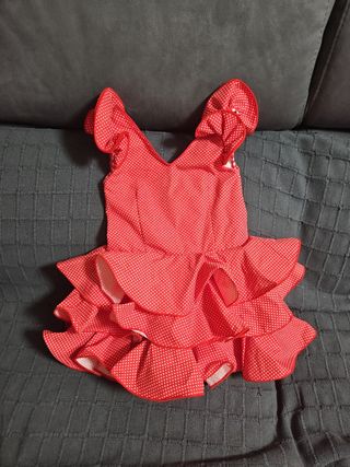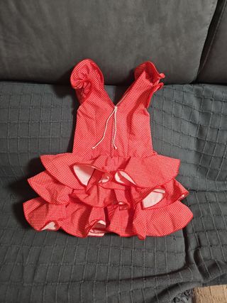 Conjunto de traje de flamenca para niña, de edad aproximada entre los 10/12 años (se puede ajustar para pequeño) 1 falda y 2 combinaciones de parte superior: - Camisa granate con volantes en las mangas y chaleco negro - Corpiño granate. - Falda larga con estampado de lunares y flores granate y negras y volantes granates. (no es de zara, es hecho por modista)
