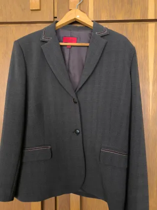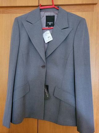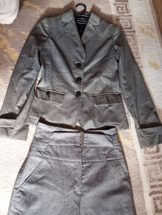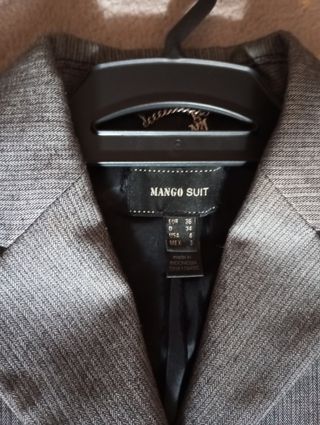 Elegante traje de chaqueta y falda de la marca MANGO, en color gris y talla 36. Está en buen estado. - Chaqueta de corte clásico con botones. - Falda a juego de talle alto. - Tejido de calidad.